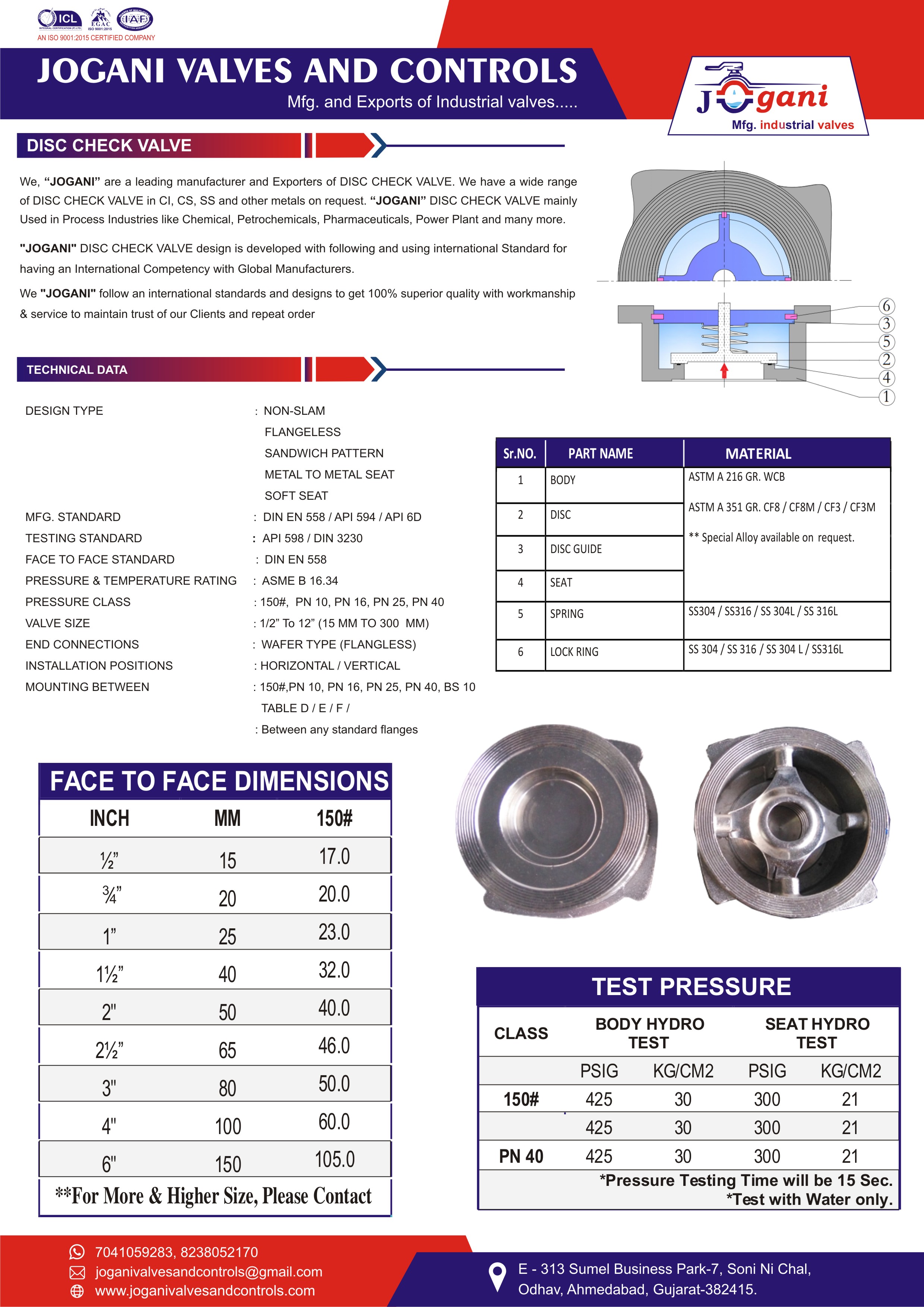 "JOGANI" DISC CHECK VALVE design is developed with following and using international Standard for having an International Competency with Global Manufacturers.